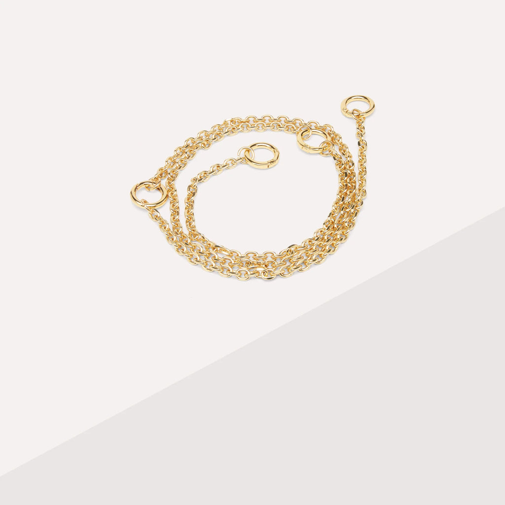 Multi-carry: crossbody, on hip, shoulder and by hand • Adjustable • Max. length: 120 cm • Gold and shiny nickel plating • Weight: 100 g • 2-year warranty