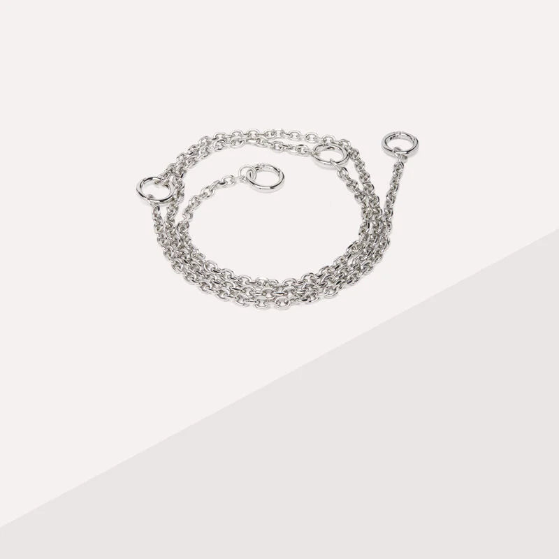 Metal crossbody strap that can be carried in different ways thanks to the openable carabiners and rings.