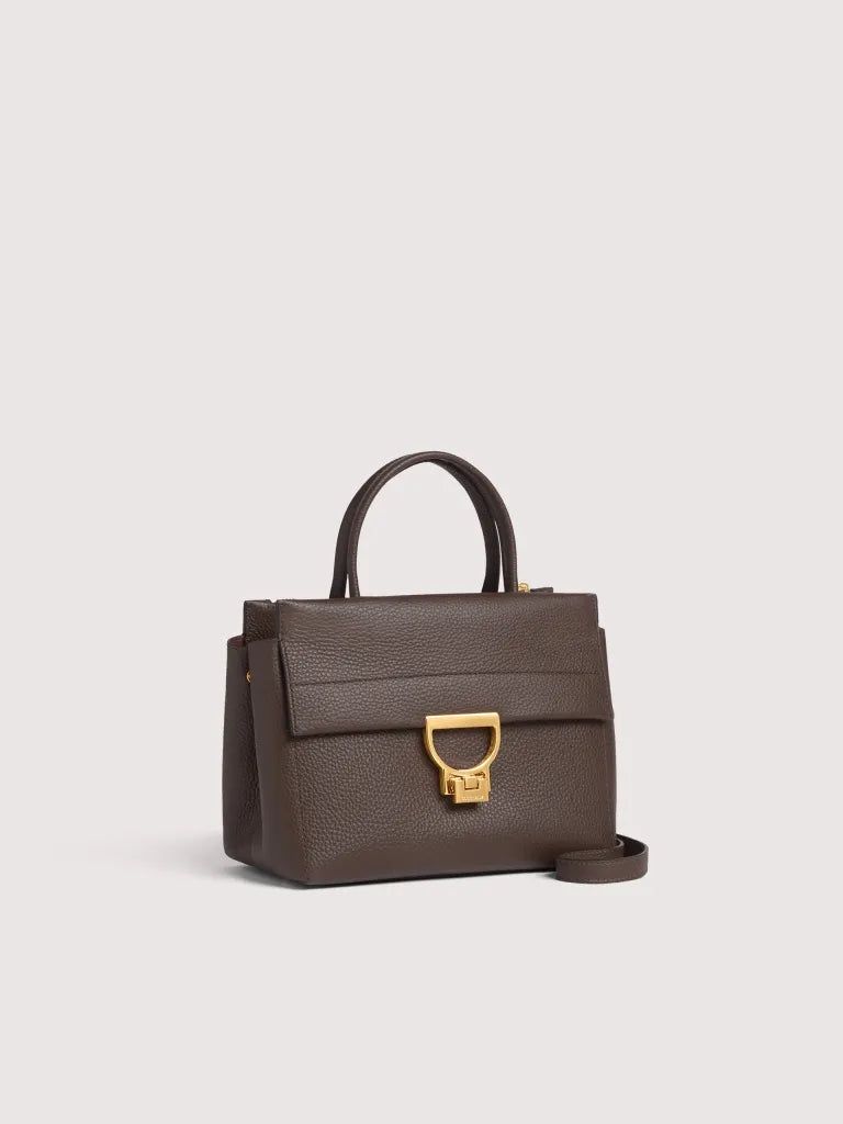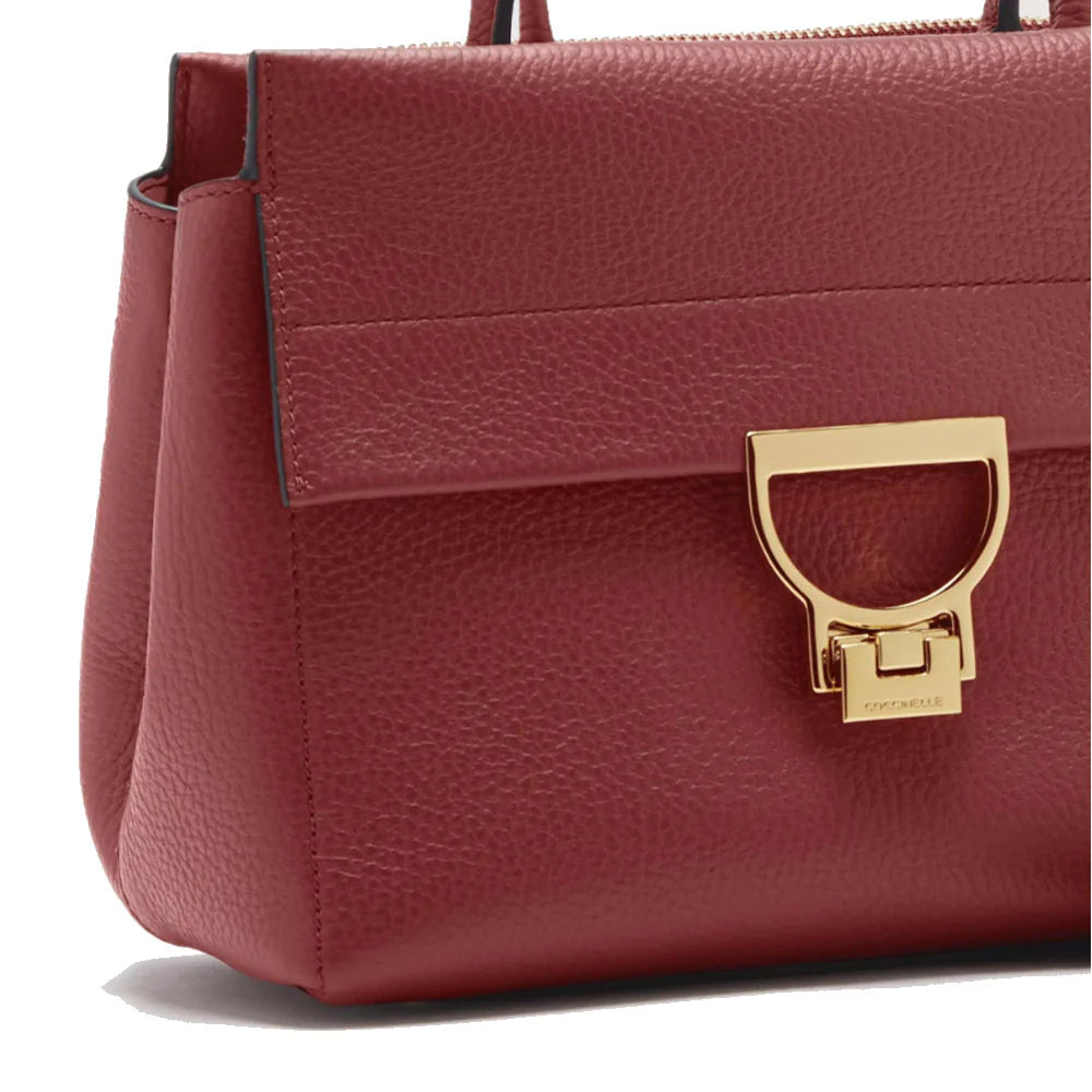A distinctive feature of the Arlettis line is the fusion of retro and 1970s taste, for an eclectic and feminine woman. The clasp, a graphic reworking of an inverted letter C, provides continuity with Coccinelle ’s distinctive elements. Blending modernity and elegance, this new model from the Arlettis line is the perfect epitome of a versatile handbag. Equipped with a shoulder strap allowing it to be carried in two ways, it is ideal for any occasion. This model is made with leather processed using specialised machines and then tumbled to maintain its softness. This is a very robust, easy to clean leather, making it ideal for everyday use.MaterialGrained leather
