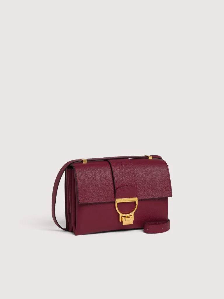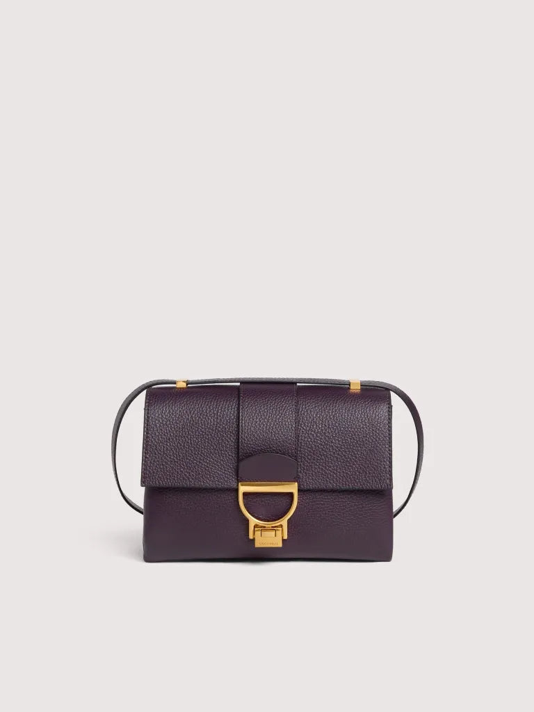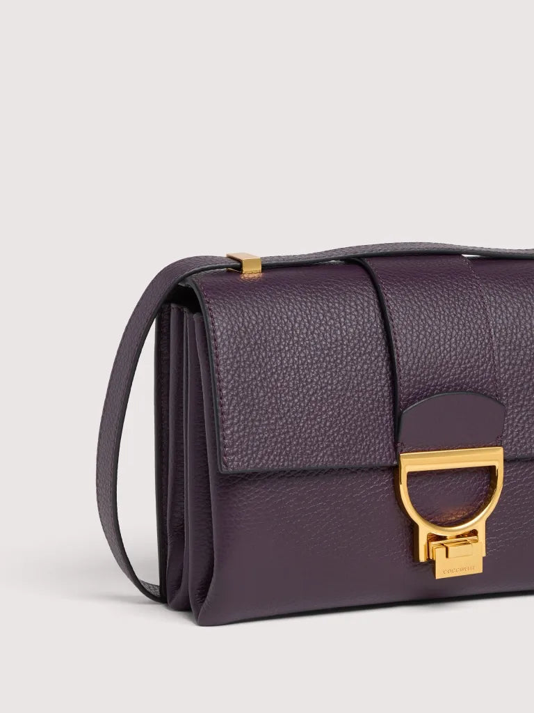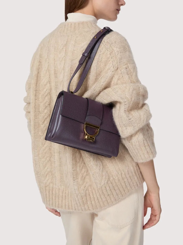 This Arlettis new style features the iconic metal fastening and the sliding leather strap that allows you to carry it over the shoulder, as well as crossbody. It stands out with its bellow construction, which makes it versatile and suitable for a range of different occasions.