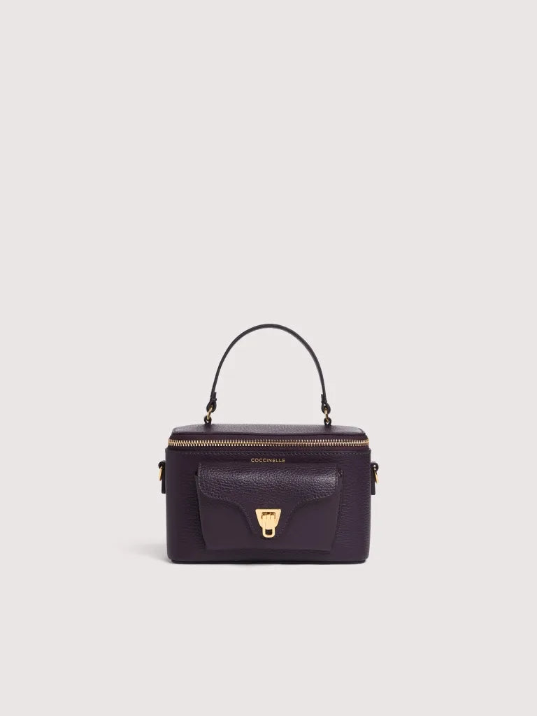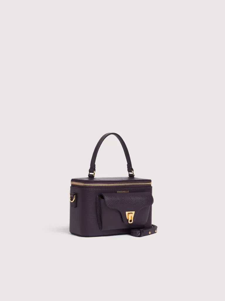 Coccinelle Beat is one of the brand’s iconic lines: the distinctive flap closure with plectrum is the symbol of Coccinelle’s identity. This mini vanity case with leather shoulder strap is a perfect mix of structure and softness, practicality and contemporary design. This model is made with leather processed using specialised machines and then tumbled to maintain its softness. This is a very robust, easy to clean leather, making it ideal for everyday use.
