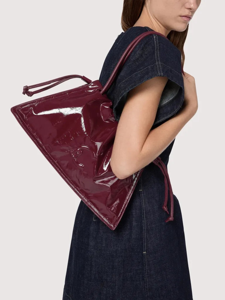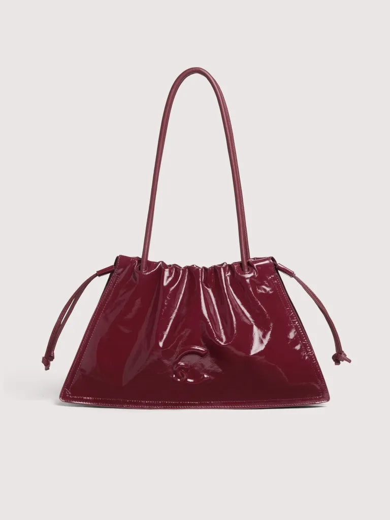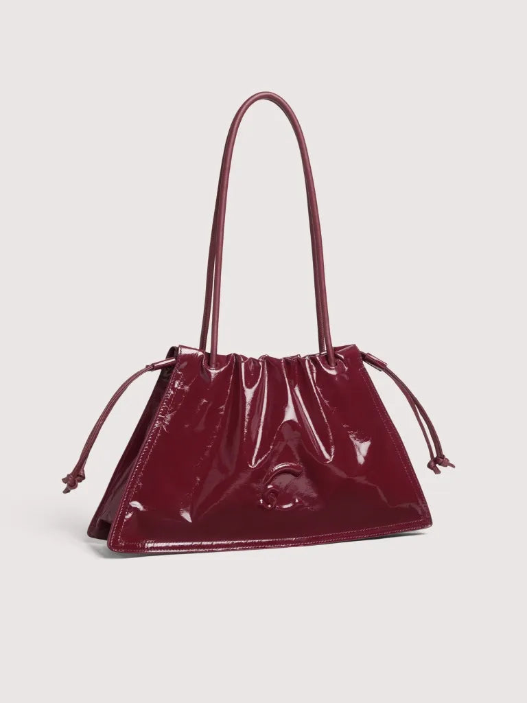 Made from glossy-effect smooth leather, the Coccinelle Dulse line highlights the elegance of the material with its distinctive soft pleats. A leather drawstring gathers the roomy silhouette of these bags, blending spaciousness with an elegant and romantic charm. The line is characterised by the new C-Me logo, created using a unique embossed technique on the leather. This model is made from leather processed using specialist machinery that applies a thin layer of varnish. The leather is then tumbled to break the surface and create a wrinkle effect.