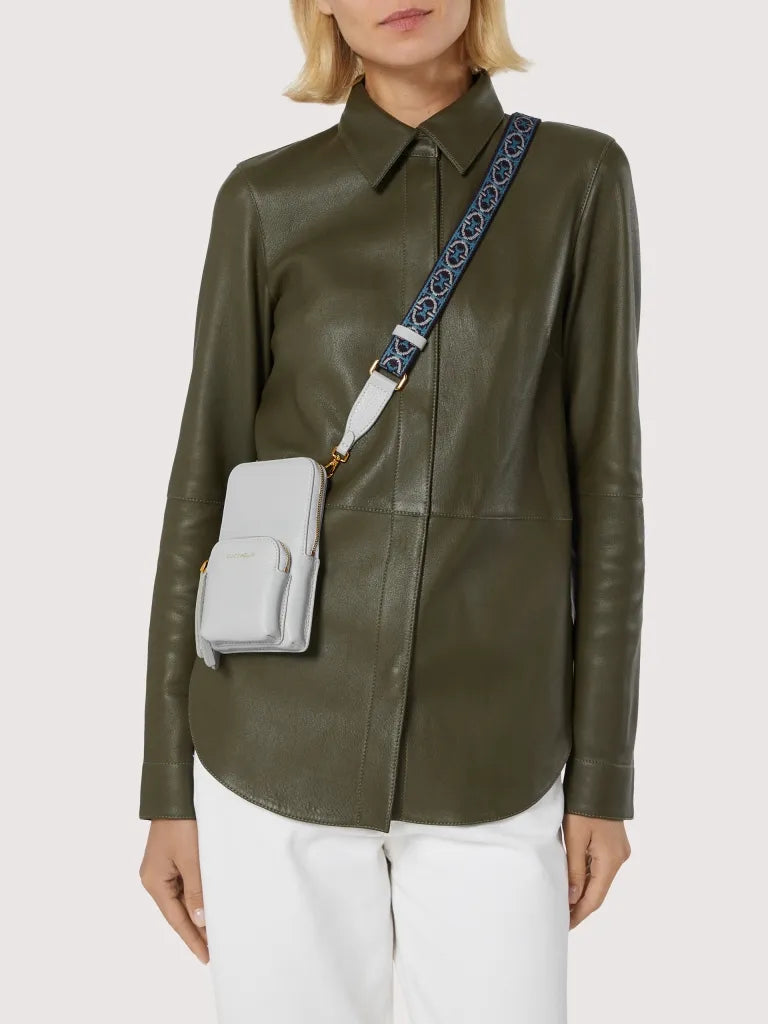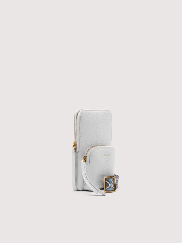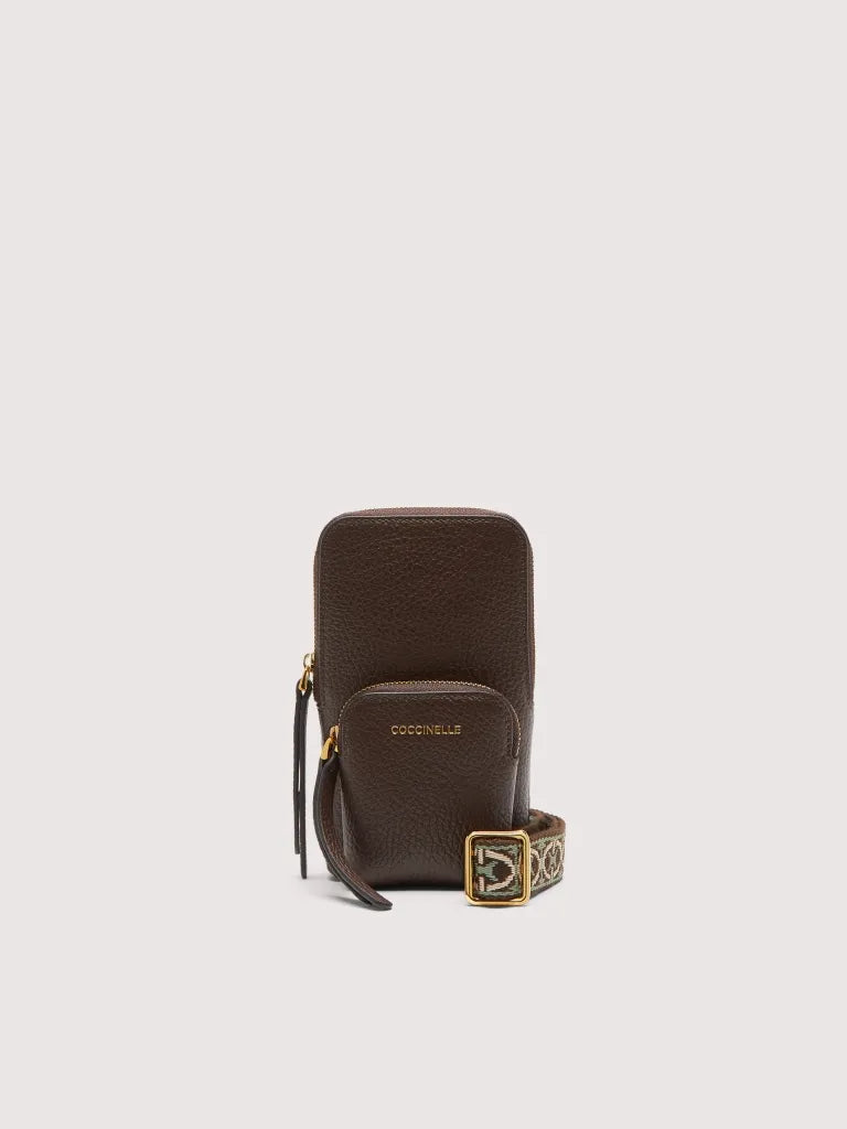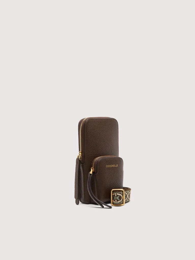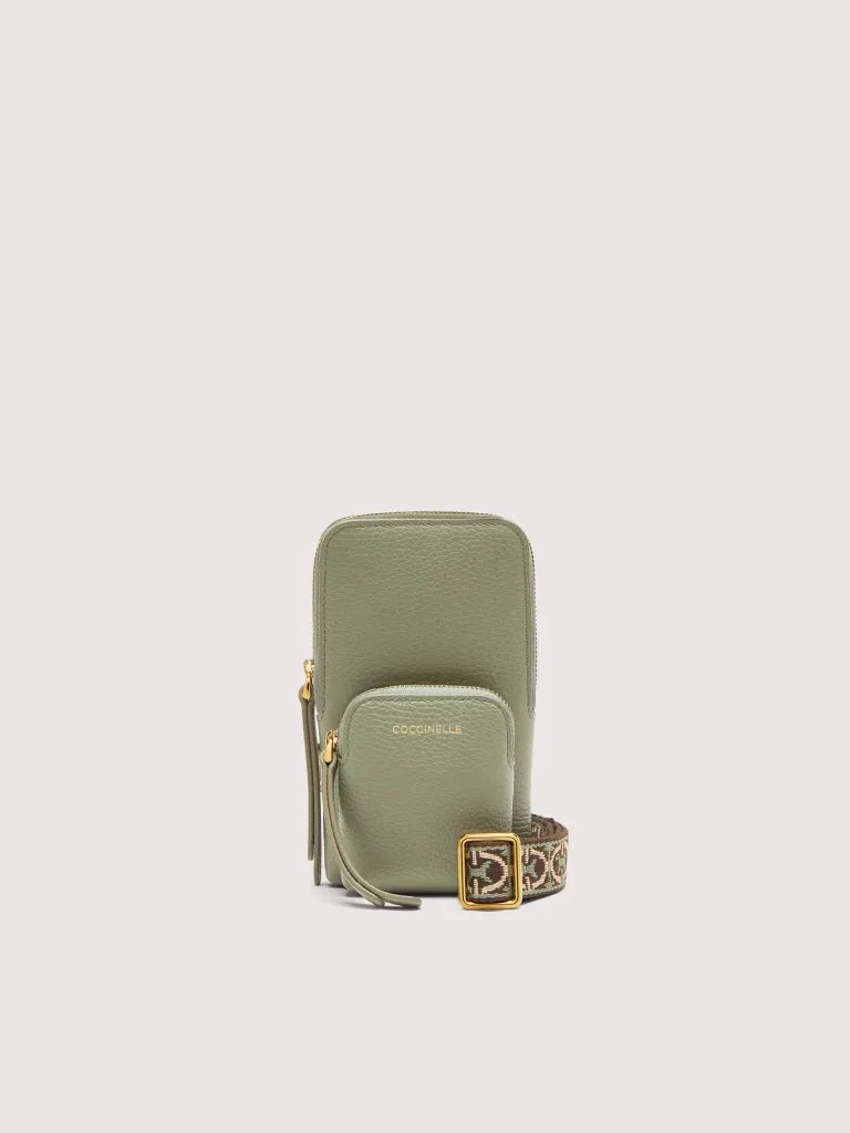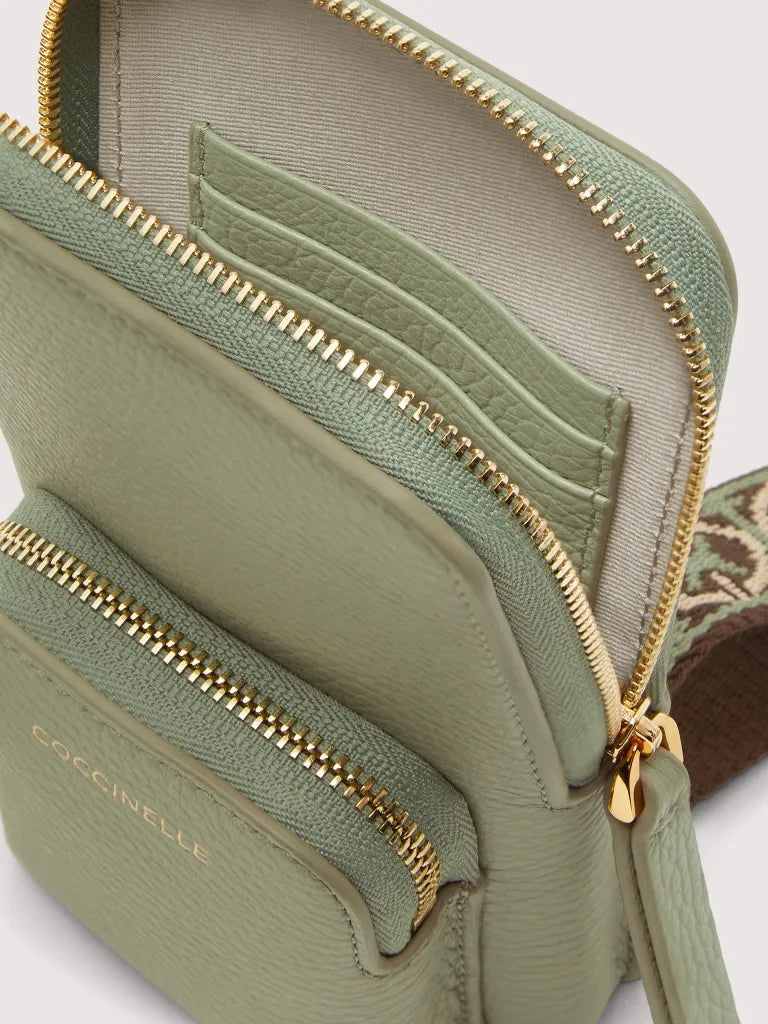Leather phone case from the Coccinelle Pixie line, perfect for keeping your phone and headphones neatly stored thanks to the zipped front pocket. The internal card holder makes it practical and the tricolour monogram ribbon shoulder strap gives it a contemporary look. A unique accessory to carry all your essentials with you whenever you need them. This model is made with leather processed using specialised machines and then tumbled to maintain its softness. This is a very robust, easy to clean leather, making it ideal for everyday use.MaterialGrained leather