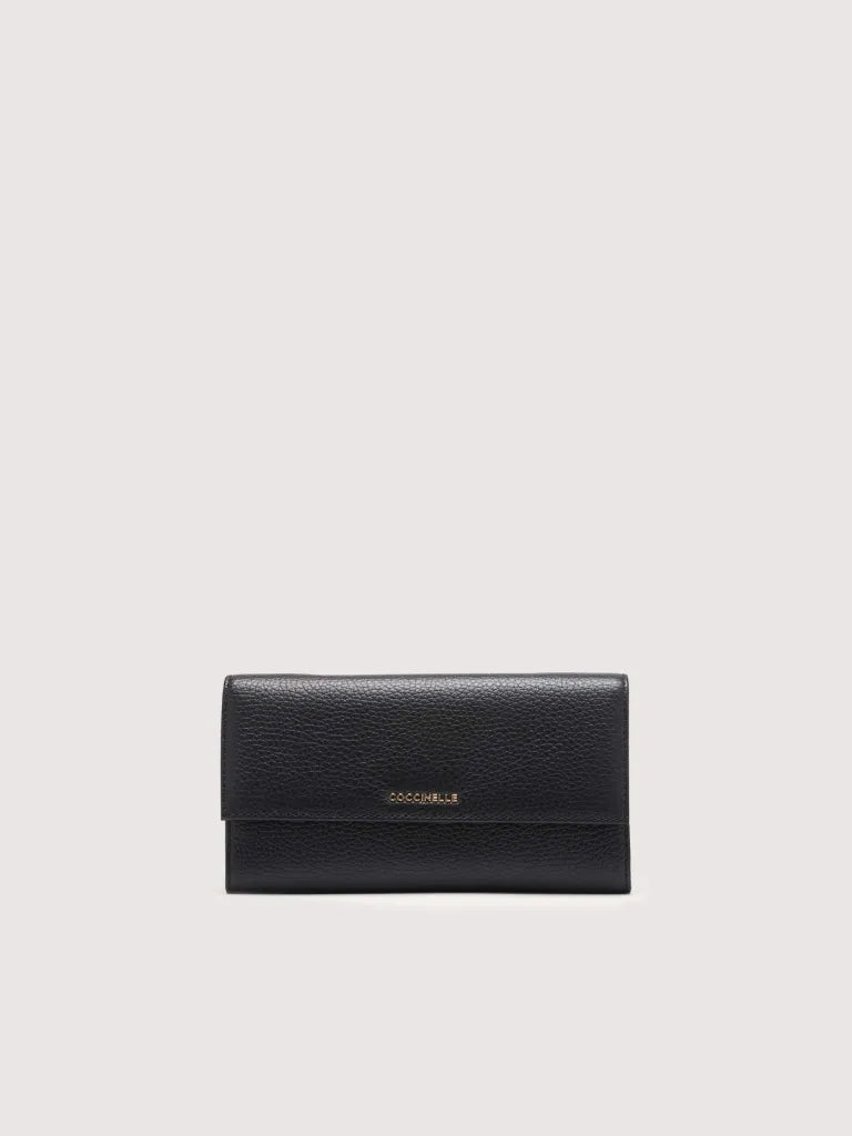 This wallet with a little strap from the Metallic line is embellished with the metal Coccinelle logo. Practical and functional, its space is well organised to tote all your necessary items neatly and carefully. In addition, the comfortable adjustable leather shoulder strap makes it perfect for wearing across the body. This model is made with leather processed using specialised machines and then tumbled to maintain its softness. This is a very robust, easy to clean leather, making it ideal for everyday us.