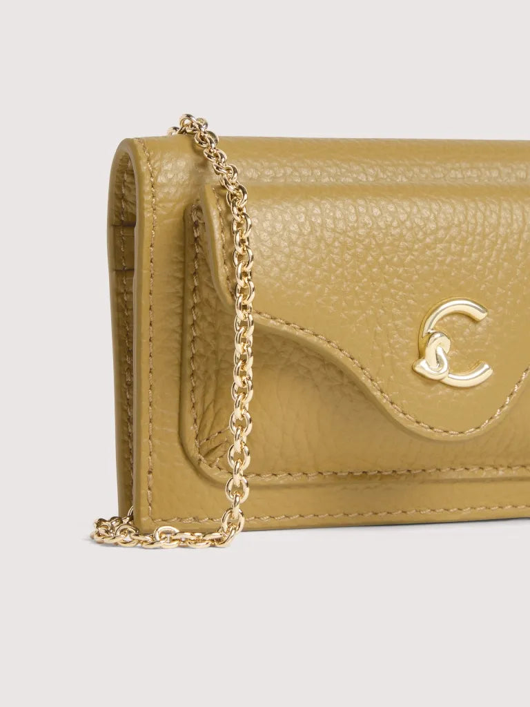Practical and compact in design, this C-Me line card holder combines functionality with elegance. The logo is reimagined with the C of Coccinelle, knots around and embraces the plectrum, an iconic element of the brand. Finished with an elegant chain shoulder strap, this accessory is also perfect for carrying on the shoulder. This model is made with leather processed using specialised machines and then tumbled to maintain its softness. This is a very robust, easy to clean leather, making it ideal for everyday use.