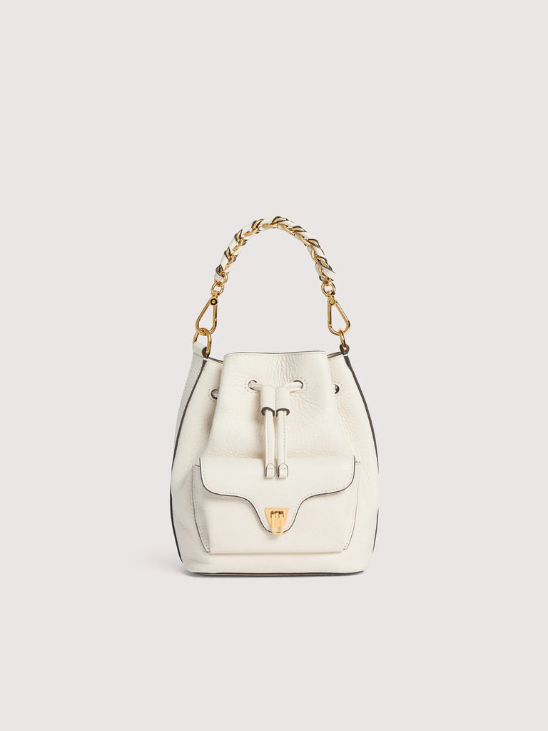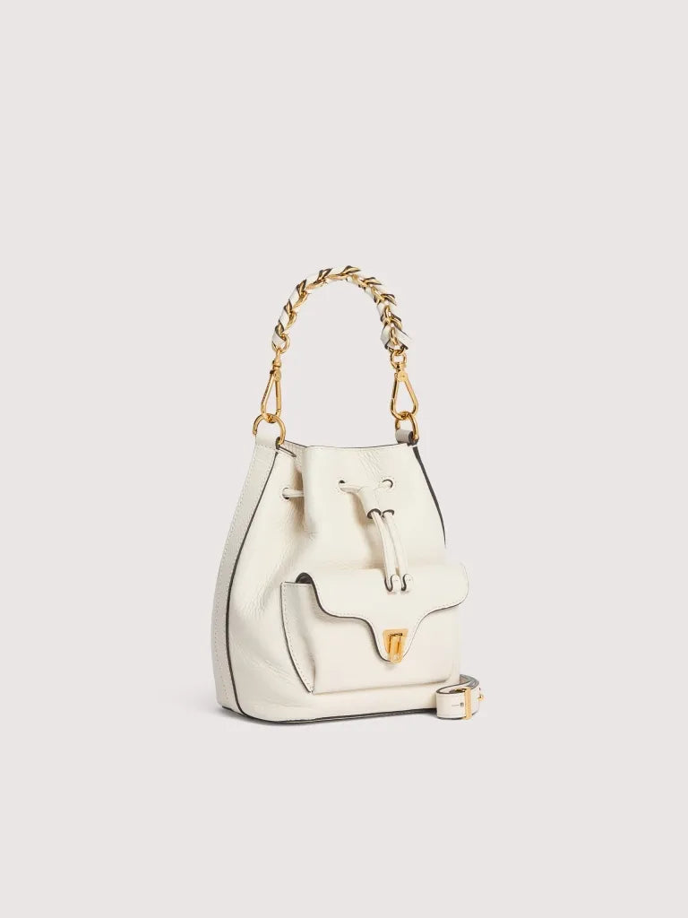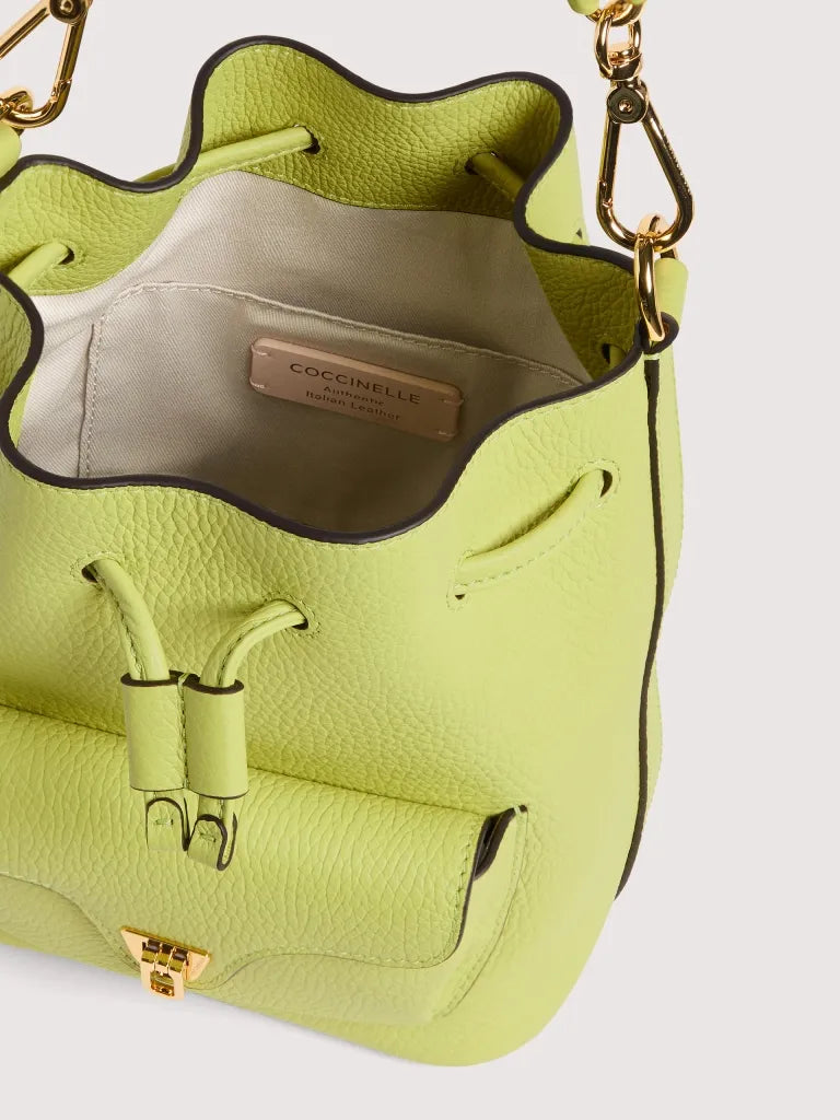 Coccinelle Beat is one of the brand’s iconic lines: the distinctive flap closure with plectrum is the symbol of Coccinelle’s identity, reimagined for this collection with elegant, modern functionality.The mini bucket bag is enhanced by a leather and chain handle, a perfect mix of structure and softness, practicality and contemporary design. This model is made with leather processed using specialised machines and then tumbled to maintain its softness. This is a very robust, easy to clean leather, making it ideal for everyday use.
