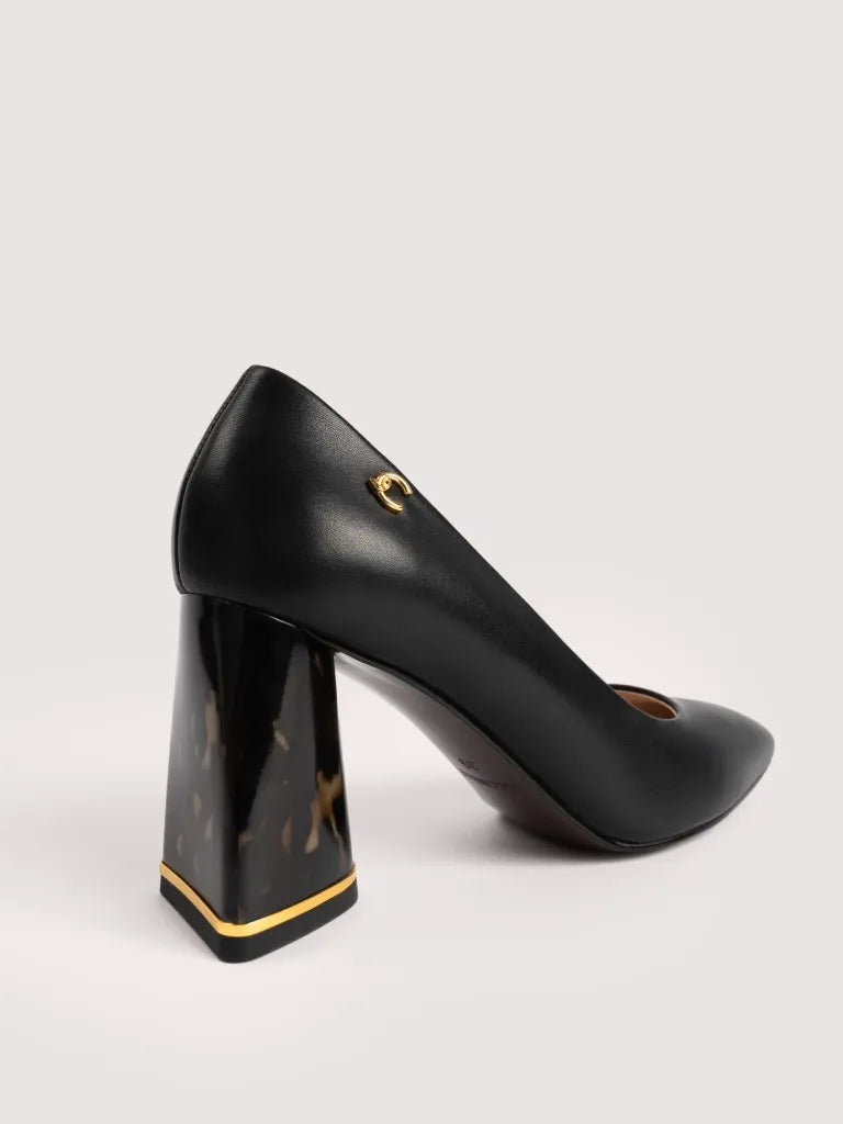 - Smooth leather with tortoiseshell-effect heel