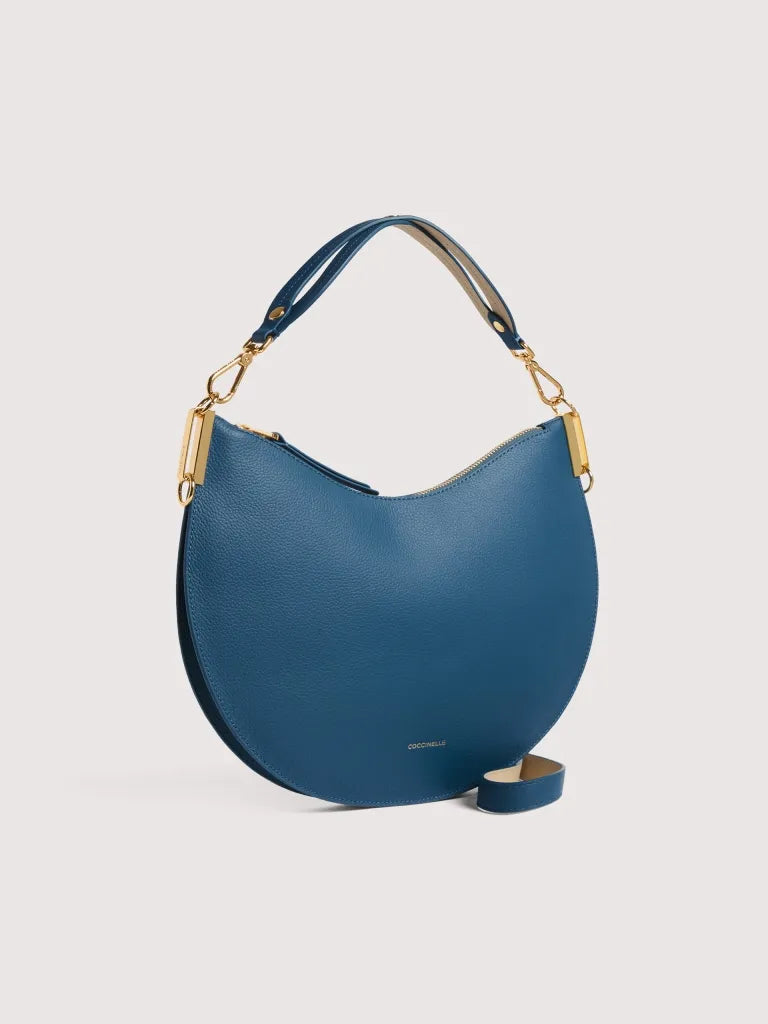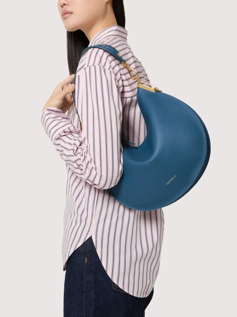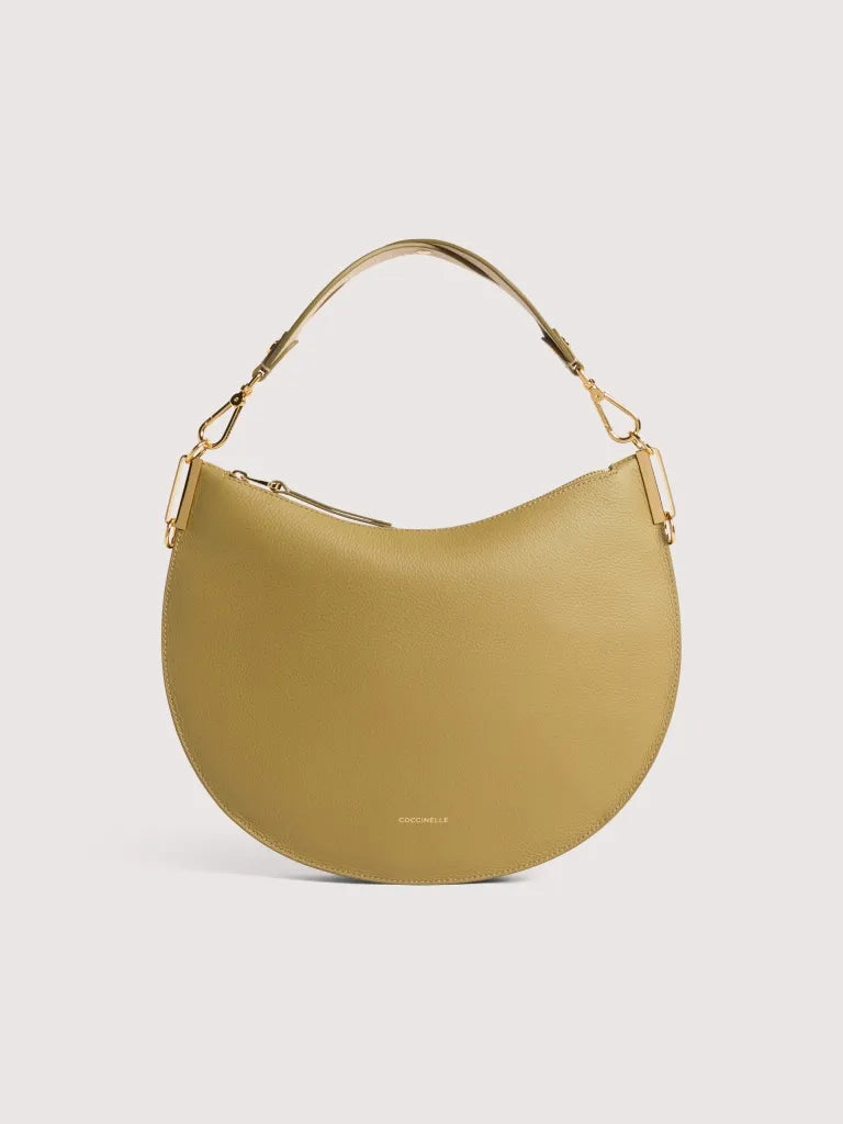 The roundness of its silhouette, also reflected in its name, is the hallmark of the Coccinelle Sunup line. The handle is the line’s distinguishing element, modelled on the same feminine curves that draw a sinuous weave, giving it a touch of originality. The two-sided leather enhances the softness and lightness of the bag, due also to the unlined interior, adding an original twist thanks to the play of contrasting colours. This model is made with leather processed using specialised machines and then tumbled for an extremely soft finish. This particular type of leather is finished with pigments on both sides to create a two-sided effect. It is made from a robust material, making it suitable for everyday use.