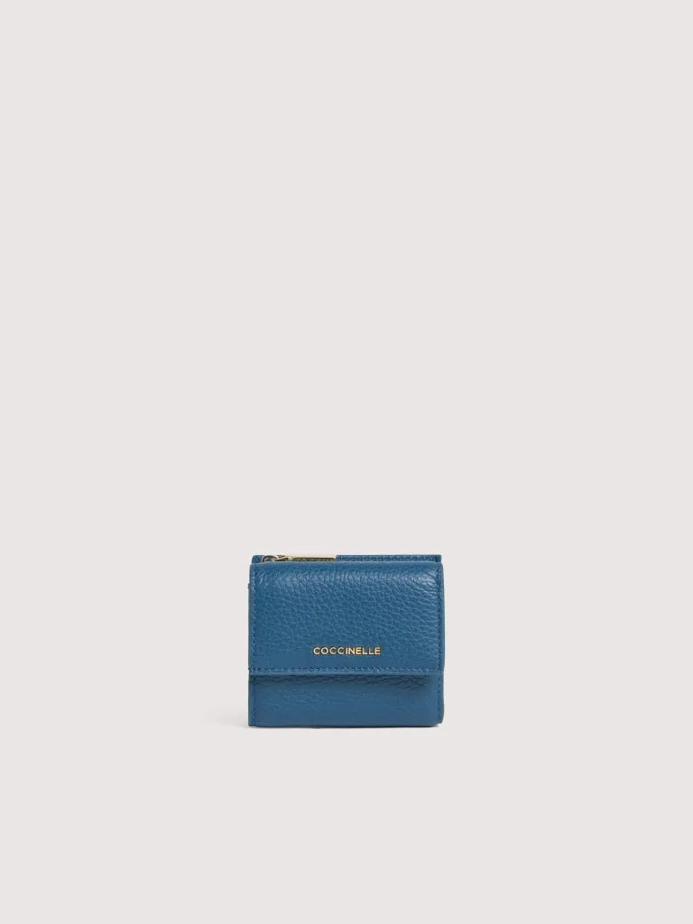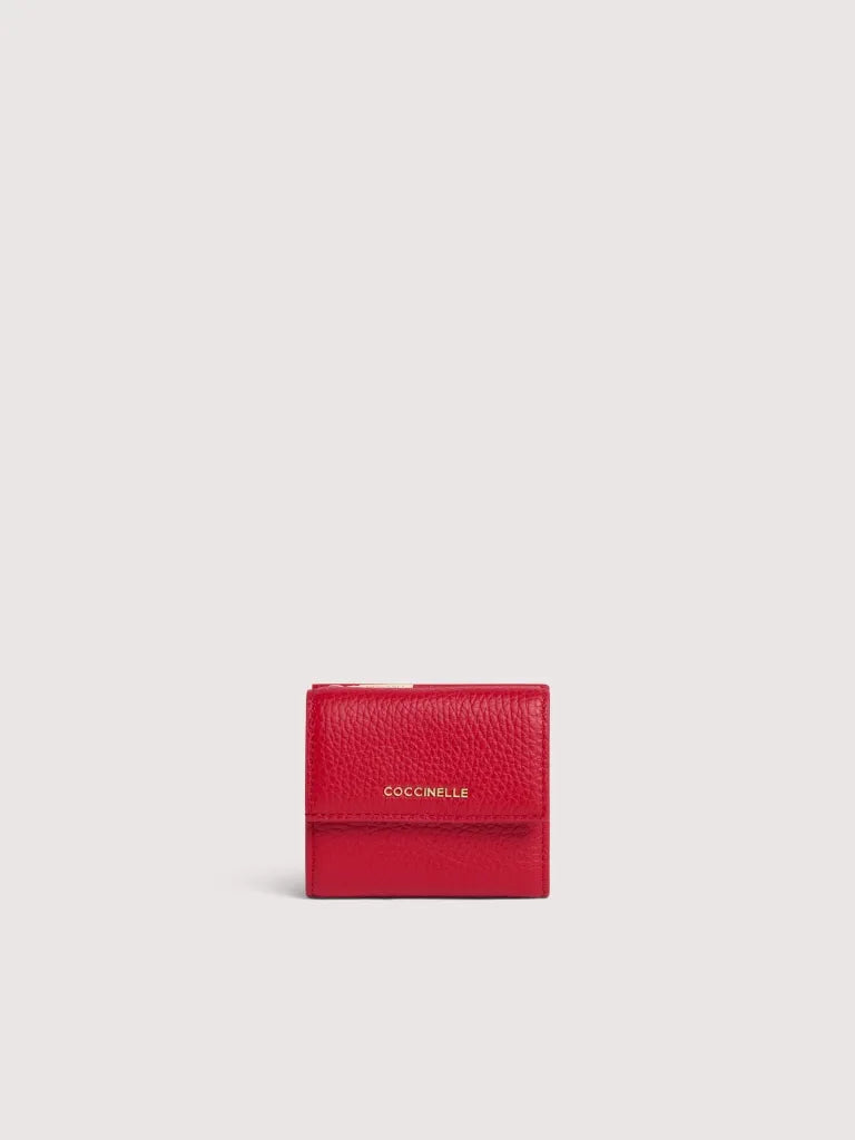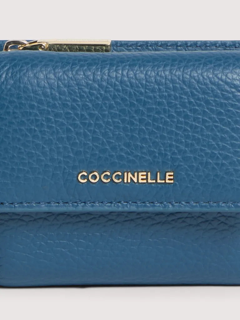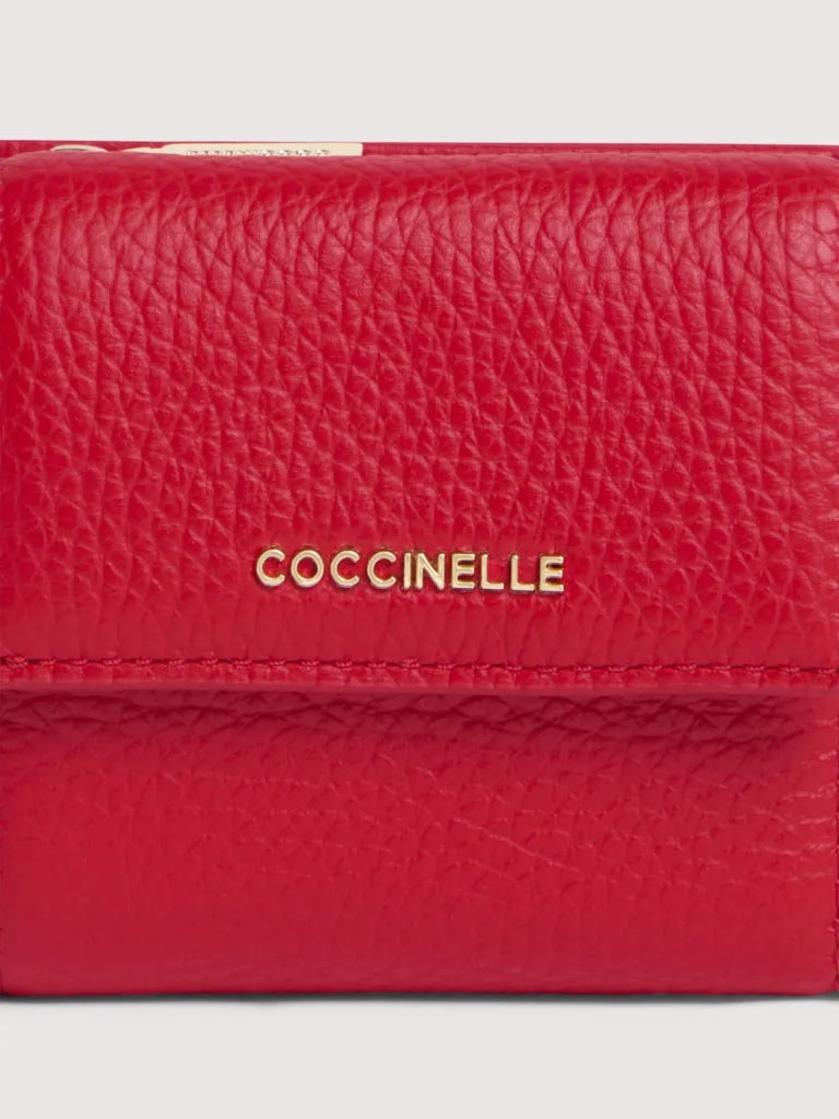 This mini wallet with a flap from the Metallic line is embellished with the Coccinelle logo in metal. Its space is well organised to tote all your necessary items neatly and carefully. This model is made with leather processed using specialised machines and then tumbled to maintain its softness. This is a very robust, easy to clean leather, making it ideal for everyday use.